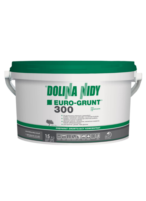 Gebruik de EURO-GRUNT 300 primer door het eerst te verdunnen met water (1:3) endaarna aan te brengen op absorberende – en poreuze ondergronden zoalscellenbeton, bakstenen en gipsplaten. Het product werkt ideaal tijdens hetvoorbereiden van oppervlakken, voordat je gips-, cement- of egalisatielagenaanbrengt. Dankzij het hoge doordringingsvermogen zorgt deze primer voor een sterke – en uniforme ondergrond, waardoor je werk perfect hecht en gemakkelijk droogt. Wacht na het aanbrengen 4-12 uur voordat je verdergaat met de volgende laag. De EURO-GRUNT 300 primer is dus veelzijdig en gemakkelijk te gebruiken.
