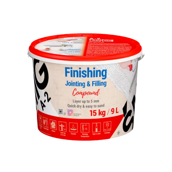 Het SMIG A-2 van SMIG UK is een veelzijdig kant-en-klaar voeg-, vul- en afwerkingsmiddel in witte pasta-vorm. Het product is speciaal ontwikkeld voor interne toepassingen zoals het glad afwerken van muren, plafonds en gipsplaten. Dankzij de gebruiksklare samenstelling kun je A-2 direct uit de emmer verwerken zonder vooraf te mengen.